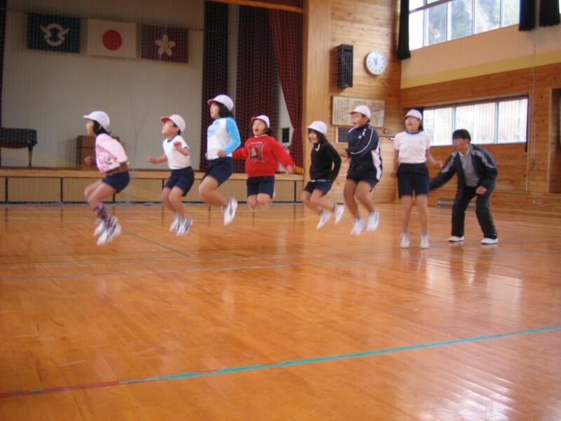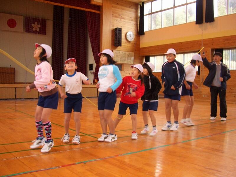 初めはなかなか跳べなかった1年生もたくさん練習してずいぶんみんなと跳べるようになりました。上級生と息を合わせて全員跳びや八の字跳びにもチャレンジ。