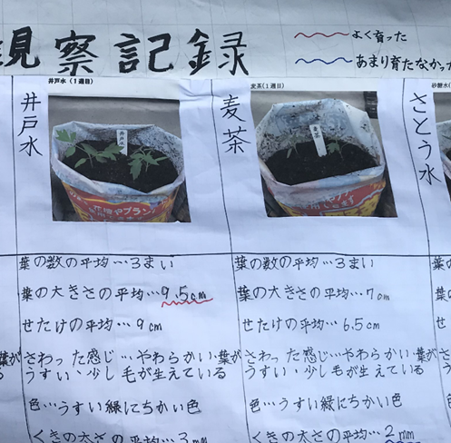 女児は、理科の時間に担当の教頭の指導の下、「ミニトマトは、どんな水を与えるとよく育つだろうか」というテーマや検証方法などを決めました。そして、夏休み中に粘り強く実験・観察をし、それをきれいに分かりやすくまとめてきました(下の写真は、そのほんの一部です)。