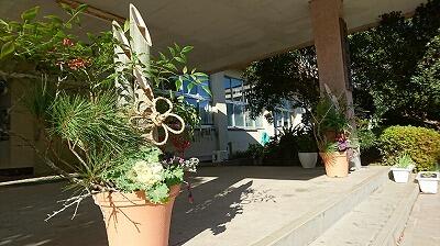 秋山小の玄関口に門松を飾りました。教頭先生の手作りです。