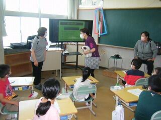 今日の5・6校時に、市の社会福祉協議会から3名の方に来ていただき、3・5年生を対象とした認知症に関する授業(認知症サポーター養成講座)を行いました。