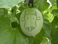 当日は、武田園芸さんのビニールハウスへ行き、キリでメロンに自分が描きたい絵や文字を描きました。