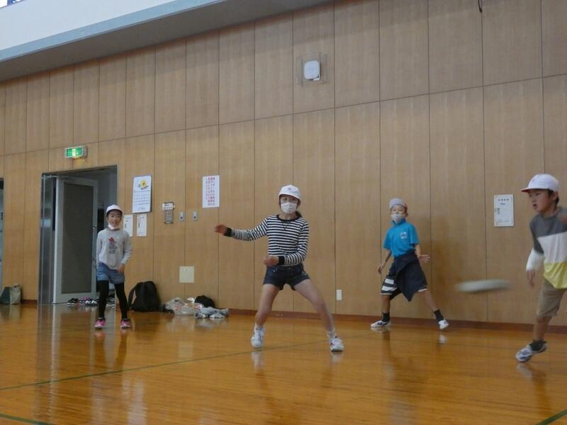 体育館ステージ上で、全員で校歌を歌い、遊びがスタートしました。ドッジビー、バドミントン、ミニバレーと大興奮の時間でした。