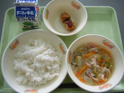 今日の給食は、麦ご飯、八宝菜、揚げシューマイ、牛乳でした。