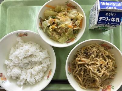 今日の給食のメニューは、ジャージャー麺、キャベツのソテー、減量麦ご飯、牛乳でした。