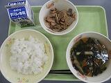 今日の給食は、吉野汁、豚肉のソテー、麦ご飯、牛乳でした。