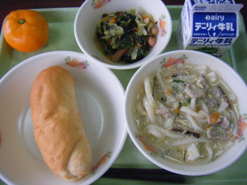 今日の給食のメニューは、卵とじうどん、ほうれん草のごまソテー、みかん、減量米粉パン、牛乳でした。