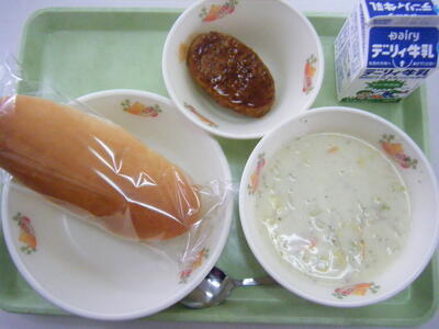 今日の給食のメニューは、白菜のクリーム煮、ハンバーグ(ケチャップソース)、コッペパン、牛乳でした。