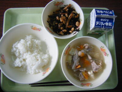 今日の給食のメニューは、豚汁、ひじきの炒り煮、白ご飯(ミルキークイーン)、牛乳でした。