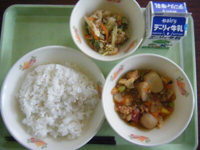今日の給食のメニューは、秋野菜の煮物、おかか炒め、麦ご飯、牛乳でした。