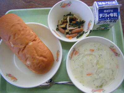 今日の給食のメニューは、白菜のクリーム煮、ウインナーと野菜のソテー、アップルパン、牛乳でした。