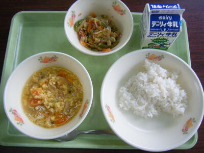 今日の給食のメニューは、親子丼の具、おかか炒め、麦ご飯、牛乳でした。