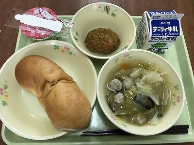 今日のメニューは、米粉パン、肉団子とキャベツのスープ、ごぼうのメンチカツ、ヨーグルトでした。