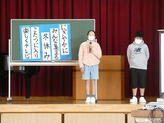 短歌の発表では、それぞれ夏休みの思い出と冬休みの思い出を短歌に表し、発表しました。その時の様子や気持ちについての説明が加わることで、その時の様子や気持ちがより伝わってきました。