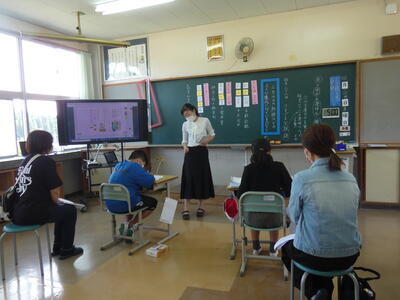 今回の訓練では、串間市役所の危機管理課の方にお願いして、ハザードマップの見方や校区内の危険箇所、避難の仕方やタイミング等についてリモートで話をしていただきました。