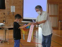 代表で3年生の児童が県被爆者の会副会長、串間支部長の郡司様に本校の5名の児童、その家族、そして職員が5月から作り始めた千羽鶴とメッセージカードを贈呈しました。