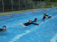 はじめの会の後、水慣れやゲームなどをし、最後は、流れるプールを児童と職員でつくりました。
