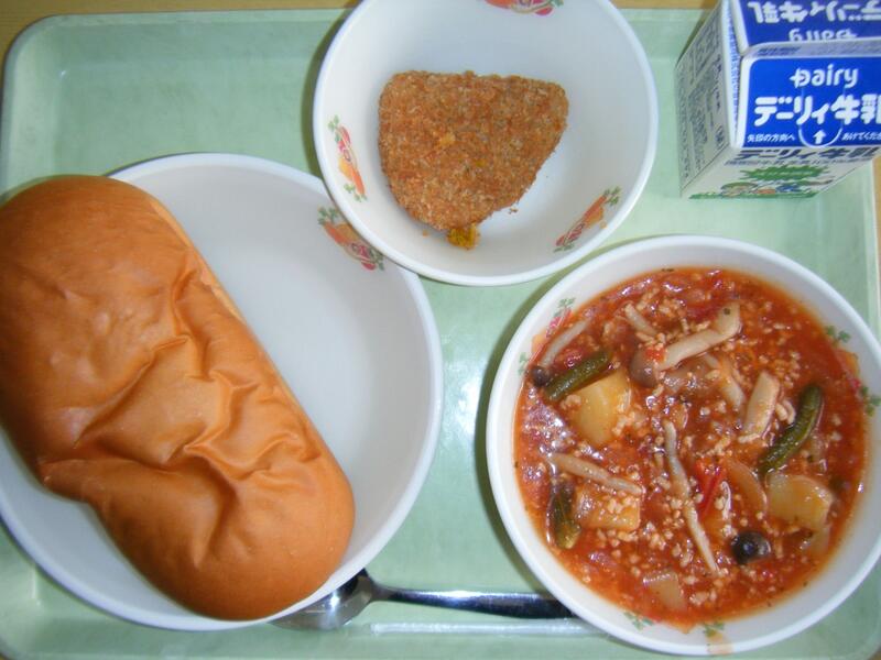 今日の給食のメニューは、じゃがいものトマト煮、かぼちゃフライ、黒糖パン、牛乳でした。