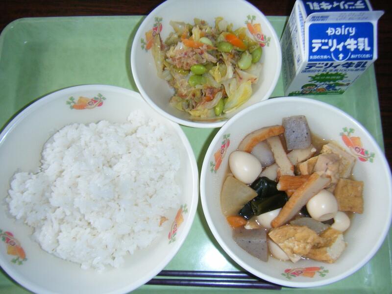 今日の給食のメニューは、みそおでん、おかか炒め、麦ごはん、牛乳でした。