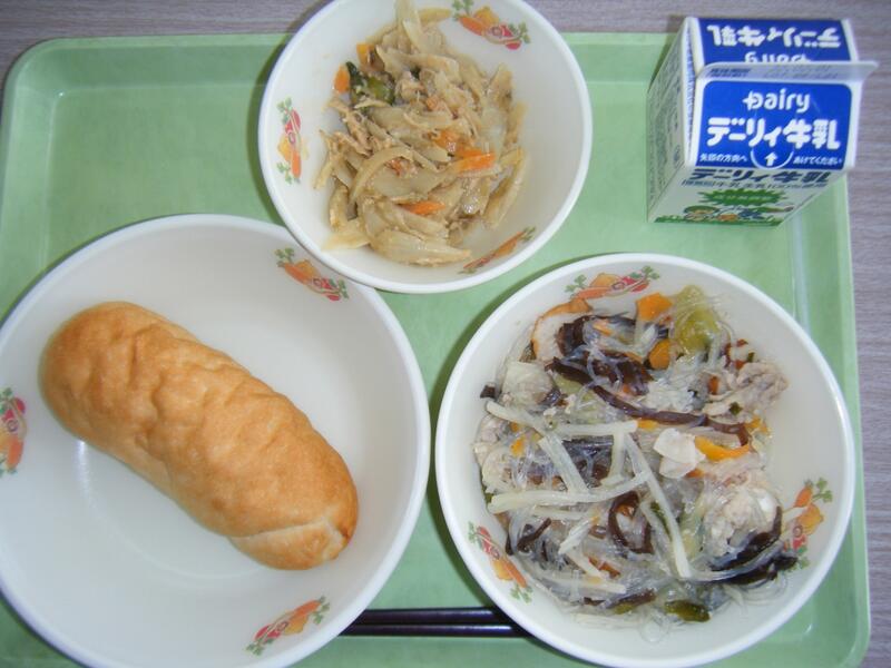 今日の給食のメニューは、タイピーエン、ごぼうのマヨソテー、減量米粉パン、牛乳でした。