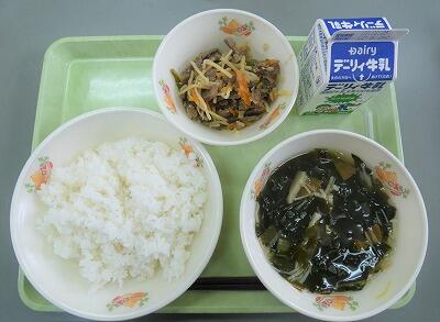 今日の給食のメニューは、麦ごはん、わかめスープ、チンジャオロース、牛乳でした。