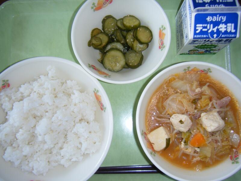 今日の給食のメニューは、キムチ鍋、きゅうりの炒め物、麦ごはん、牛乳でした。