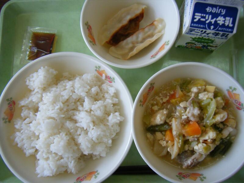 今日の給食のメニューは、豆腐の中華煮、ギョーザ、たれ、麦ごはん、牛乳でした。