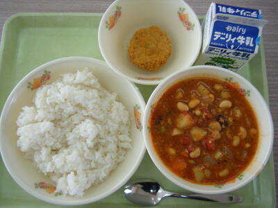 今日の給食のメニューは、チリコンカン、彩り野菜のミンチカツ、麦ご飯、牛乳でした。