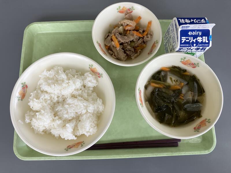 今日の給食のメニューは、わかめスープ、豚肉のプルコギ、麦ご飯、牛乳でした。