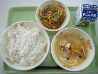 今日の給食のメニューは、吉野汁、豚肉のしょうが焼き、白ご飯、牛乳でした。