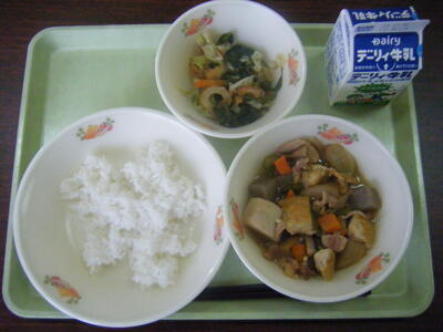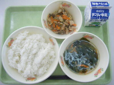 今日の給食のメニューは、うま煮、おかか炒め、麦ご飯、牛乳でした。