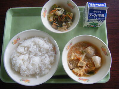 今日の給食のメニューは、豆乳キムチ汁、千切り大根と昆布の炒め物、麦ご飯、牛乳でした。