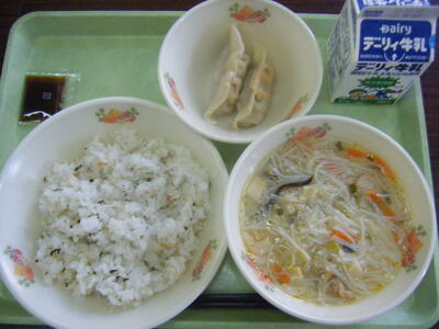 今日の給食のメニューは、汁ビーフン、ぎょうざ、ぎょうざのたれ、減量鮭菜飯、牛乳でした。