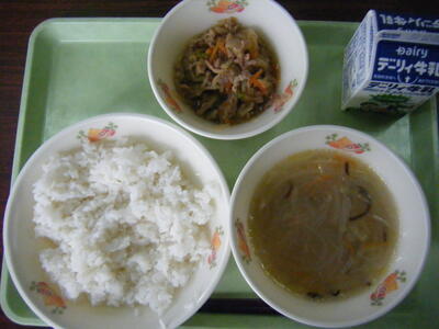 今日の給食のメニューは、春雨スープ、ひむか丼の具、麦ご飯、牛乳でした。