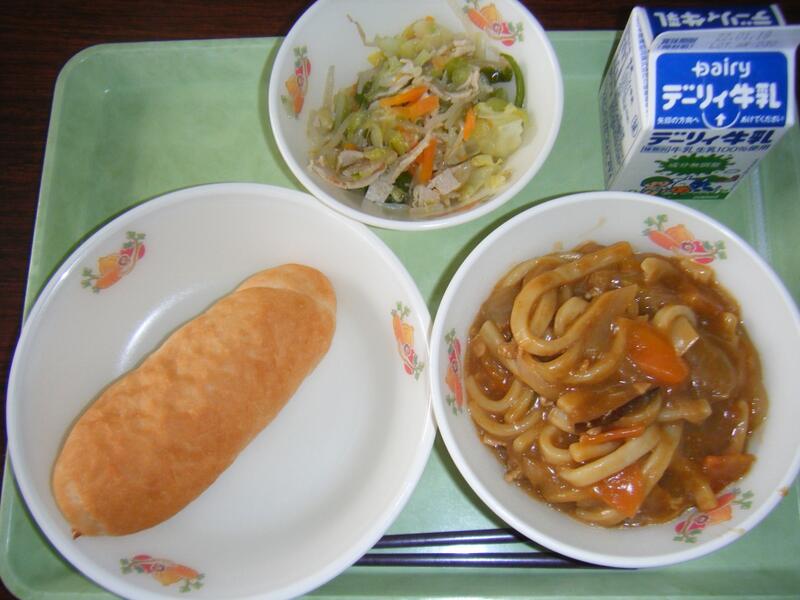 今日は、3学期始業の日です。今日の給食のメニューは、カレーうどん、ハムソテー、減量米粉パン、牛乳でした。