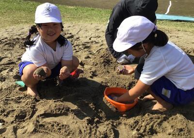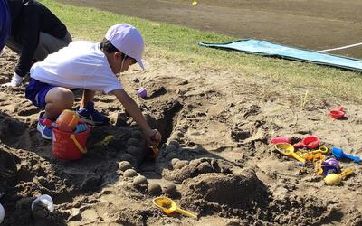 砂場で山を作ったり、穴を掘ったり、型抜きをしたりして活動しました。