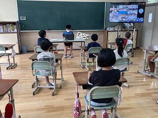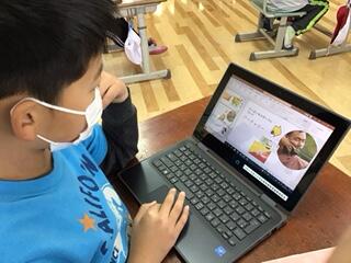 始業式をオンラインで実施しました。代表児童の作文発表など、スムーズに進みました。