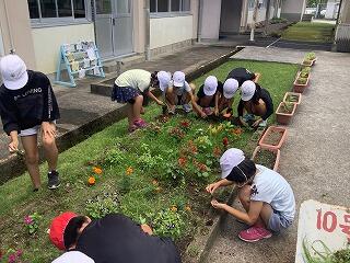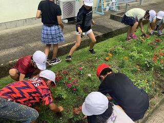 梅雨の時期に伸びた花壇の雑草を、3年生みんなで協力して抜きました。