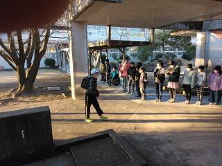 きれいに1列に並んで、登校する人たちを待ちます。朝早くからたくさんの人たちが集まりました。