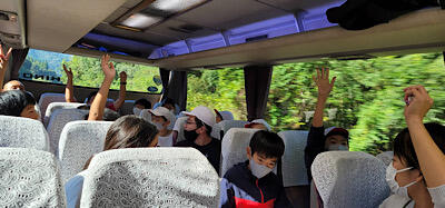 バスの中でアメ玉争奪ジャンケン大会!盛り上がってます。