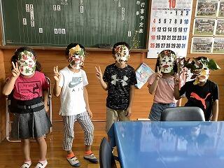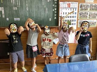 生活科の「あきとなかよし」の学習で作製したお面をかぶり