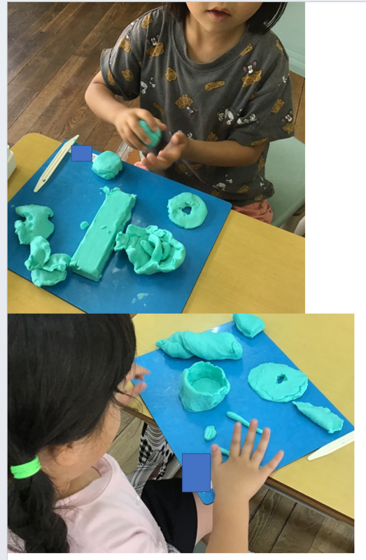 ねんどをちぎったり、ころがしたり、丸めたりして、ごちそうを作っていきました。