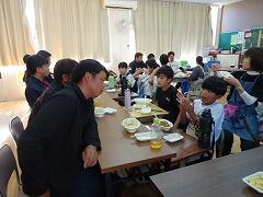まず、お隣の甘藷センターを訪問し、出荷のルートを見学したり、センターの方からお話を伺ったり質問をしたりしました。次に、運動場で、実際に畑に農薬をまくドローンを見せていただきました。講師の方が操作するドローンが浮き上がると、児童は歓声を上げ、ドローンの動きを興味深く見ていました。そして、調理実習。甘藷はもちろん、串間産の野菜や牛肉を使ったスイートポテトサラダとカレーを作りました。もちろん、おいしくできあがり、講師の皆様と語り合いながらいただきました。