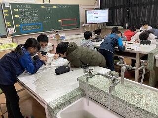 理科室では、5年生が歓声をあげながら実験していました。