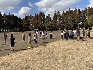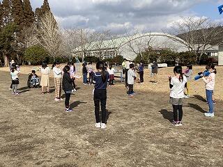3年生が運動場で音楽の授業をしていました。