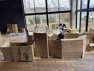 段ボールを使って「基地(すみか)?」を作っているようです。