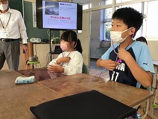 代表児童には心音拡張器を当ててもらいました。クラスに響くような心音が聞こえました!生きていることを感じることができましたね。