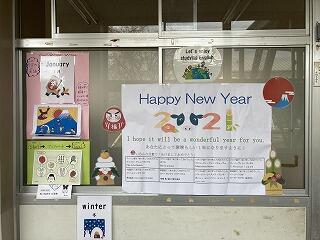 外国語準備室前には、いろんな国の新年のあいさつが掲示されています。