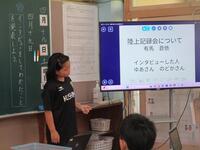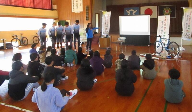 今日は、鹿屋市からプロ自転車チームのシエルブルー鹿屋の皆さんが来られ、自転車についての話をしていただきました。2027年に宮崎県で国スポ・障スポが開催され、串間市は自転車競技の会場となっています。その関係で、シエルブルー鹿屋のチームが本城で合宿をされており、休息日の今日、「夢教室」と題してお話に来てくださいました。自転車競技についての説明や子どもたちが自転車の乗る時の注意等の話をしていただき、実際に自転車に乗せていただきました。選手の皆さんは体型がシュッとされており、ユニフォームもかっこよかったです。大変貴重な時間を過ごすことができました。シエルブルー鹿屋の皆さん、ありがとうございました。