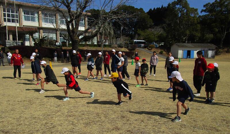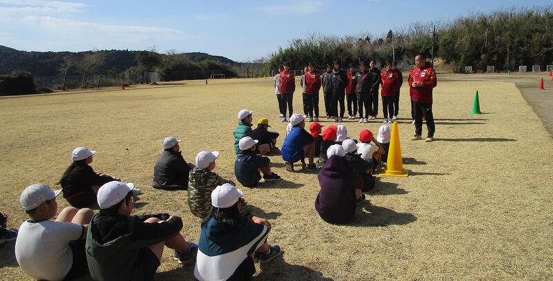 今日は、近くの温泉施設で合宿中の名城大学女子駅伝部との交流会が行われました。当駅伝部は、昨年度まで全国7連覇している大学日本一のチームです。体をほぐす運動をした後、大学生と小学生混合のチームを6つつくり、ミニ駅伝大会を行いました。大変盛り上がりました。天候にも恵まれ、暖かい日差しの中、楽しく交流できました。名城大学の監督、選手の皆さん、ありがとうございました。