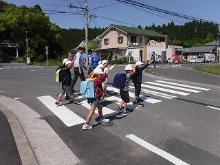 警察の方をお招きして、横断歩道の安全なわたり方を指導していただきました。校門前で練習した後、スーパーホンダの前の交差点で練習しました。みんなと一緒のときはできますが、一人になった時に、同じようにできるかが問題です。自分の身は自分で守る意識が高まるといいですね。